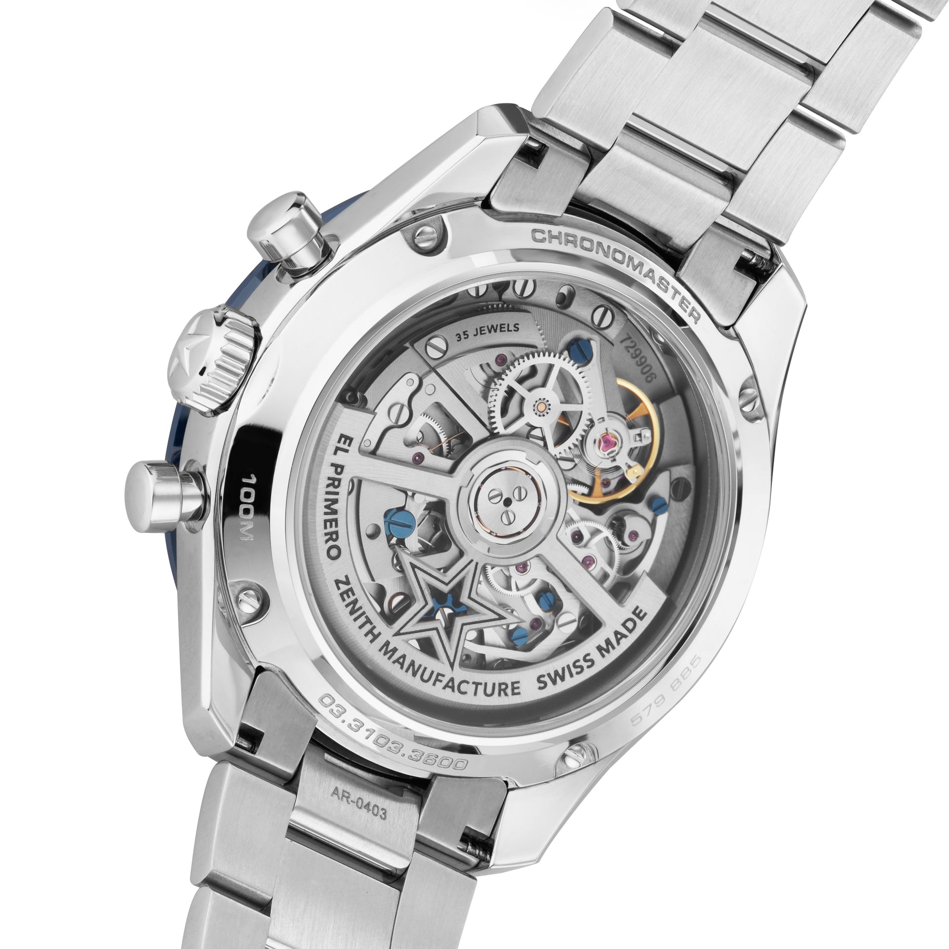 Available in a limited edition of 100 pieces, the Chronomaster Sport Watches of Switzerland edition captures the shared heritage of the two leading industry experts. This exclusive watch comes with both a three-link steel integrated bracelet and the new option of a blue rubber strap, exploring a different side of sportiness. In the three years since its introduction, the Chronomaster Sport has made its mark and solidified its position as a leading contender among sporty chronographs. The heir to a long legacy of ZENITH chronographs that began prior to the game-changing El Primero’s launch in 1969, the Chronomaster Sport is the culmination point in the Manufacture’s pursuit of precision, performance and design. To commemorate the centenary anniversary of Watches of Switzerland, ZENITH have crafted the engraved 1/10th of a second bezel on top of the 41mm steel case in deep blue ceramic for the first time in the Chronomaster Sport collection - a nod to the Watches of Switzerland Group’s signature navy blue. Unmistakably a Chronomaster, the dial features ZENITH’s signature tricolour counters in shades of grey. Inside the watch is a high-performance version of ZENITH’s iconic El Primero chronograph calibre. When it debuted in 1969, the original El Primero became the world’s first high- frequency, fully integrated chronograph movement, beating at 36,000vph, or 5hz. Its autonomy has also been rendered more efficient, with an extended power reserve of 60 hours. The sapphire display back provides an unobstructed view of the movement’s contemporary architecture features a sleeker and more open design, revealing a blue column wheel and open rotor marked with the five-pointed star ZENITH. Around the periphery of the caseback the engraving marks ‘ONE OF 100’.