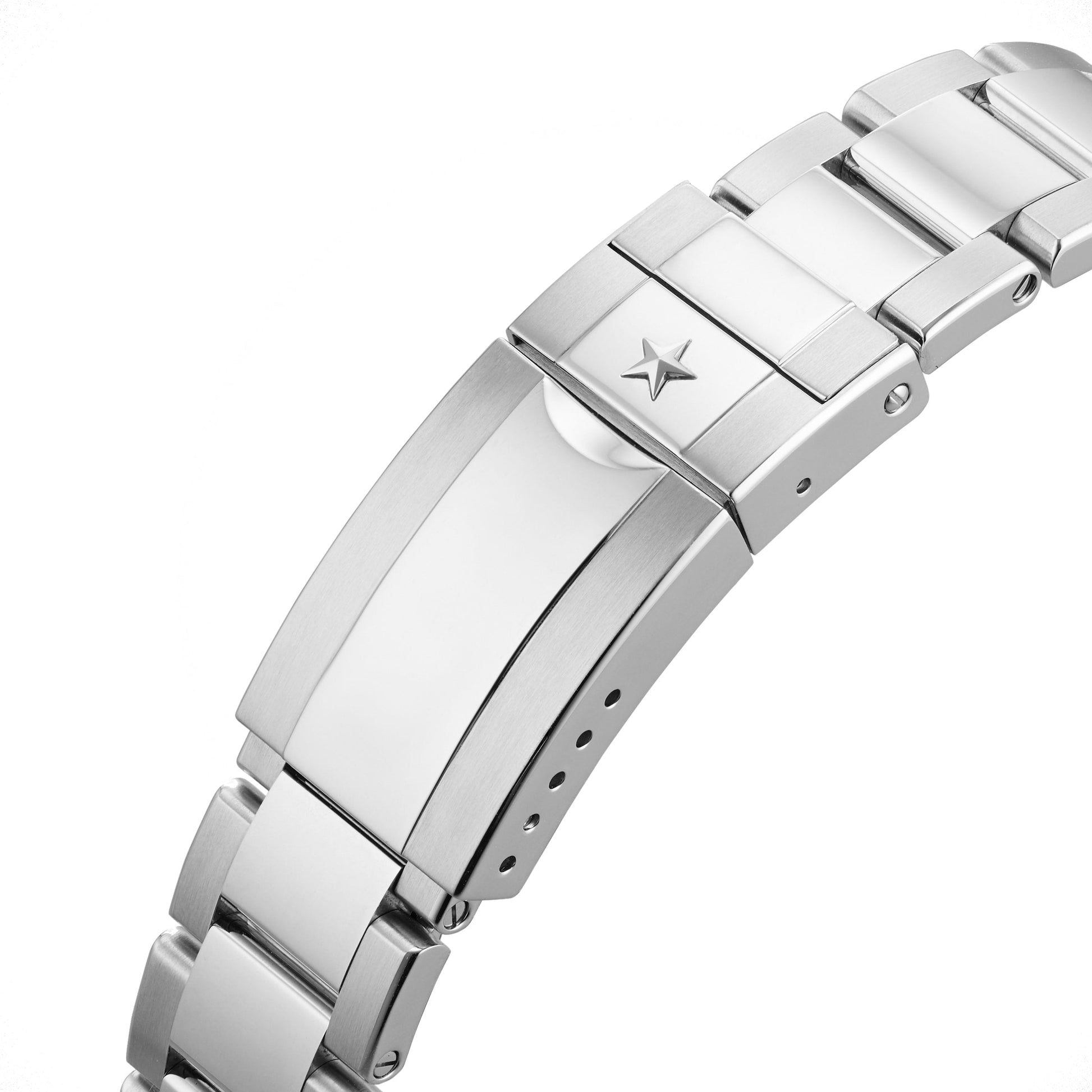 A watchmaking icon, exclusive to the Watches of Switzerland Group Presented in a 38mm stainless steel case with the same proportions as the classic A386 Silver dial with grey tricolour counters and striking blue accents Measures and displays elapsed time with 1/10th of a second accuracy Driven with precision by the iconic El Primero 3600 movement AN UPDATED ICON Bridging the past and present, the Chronomaster collection embodies the brand’s mastery of automatic, high frequency chronograph movements and the unique design language established over the course of 50 years. The Chronomaster Original borrows its proportions and aesthetics from one of Zenith’s most iconic models, the A386. Upon its release in 1969, this was the world’s first automatic, integrated high-frequency chronograph calibre. This Watches of Switzerland Group exclusive presents an alternate take on the famous tricolour sub dials, taking the blue tone of the third dial and transposing it to the 1/10th of a second chronograph track. The central chronograph hand, along with three sub-dial hands, are in the same striking blue tone, leaving the tricolour in three shades of grey. AN ODE TO THE A386 Driven by the El Primero 3600 movement, this high performance timepiece is accurate to 1/10th of a second. The extended, 60-hour power reserve ensures flawless, uninterrupted performance. Smartly presented in a 38mm steel case, the silver dial features three tricolour counters - a 60-minute counter at 6 o’clock, 60-second counter at 3 o’clock, and small seconds counter at 9 o’clock. A steel ladder bracelet completes the classic aesthetic.