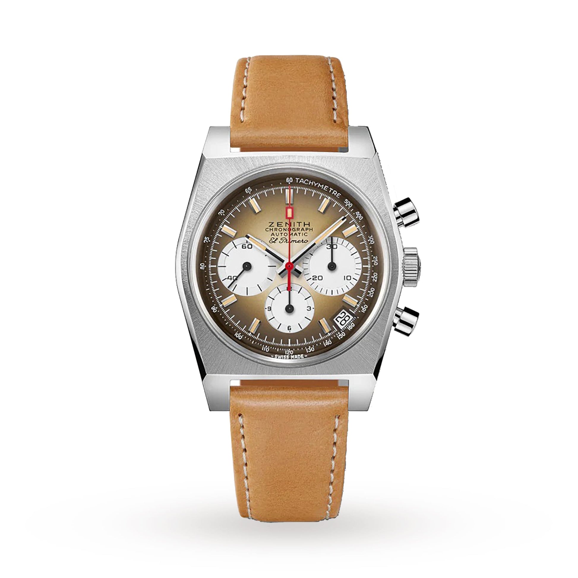 A faithful reproduction of one of the three El Primero models from 1969 Presented in a tonneau-shaped 37mm case Gradient dial in warm tones with three white counters Paired with a light brown calfskin leather strap Driven with precision by the iconic El Primero 400 movement THE RETURN OF AN ICON Bridging the past and present, the Chronomaster collection embodies the brand’s mastery of automatic, high frequency chronograph movement and the unique design language established over the course of 50 years. A faithful reproduction of one of the three original Zenith watches to feature the El Primero high frequency automatic calibre from 1969, this timepiece marks the return of an icon. Staying true to the original production plans, the model makes a statement with an interesting tonneau-shaped case and a gradient dial in warm tones that darken towards the edges. A FAITHFUL REPRODUCTION Housed in a 37mm steel case, the smoked brown gradient dial features three white counters and a distinctive vignette effect that darkens towards the edges. A red central chronograph hand adds an element of colour to the monochrome dial, while a tachymetric scale, date display at 4:30, and small seconds at 9 o’clock enhance functionality. Power and precision come courtesy of the El Primero 400 movement. Originally introduced in 1969 as the world’s first automatic chronograph calibre, today the movement is still renowned for its unrivalled precision. A light brown calfskin leather strap completes the look, developing a unique patina over time.