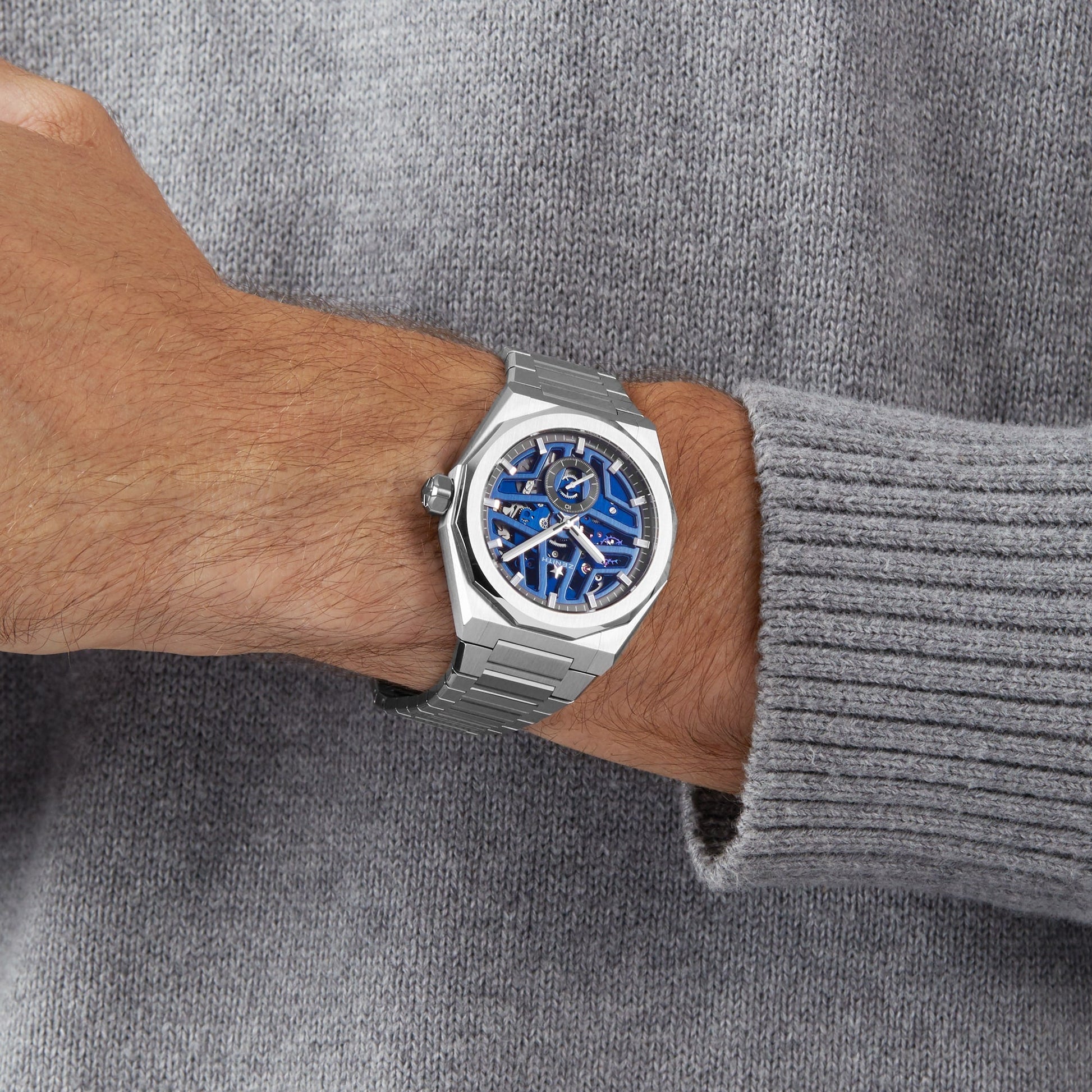 Defy Skyline – the Defy for the new era Sleek and evocative design meets unprecedented function Presented in a 41mm steel octagonal case with a faceted bezel Blue open dial, revisiting the emblematic Zenith four-pointed star Driven by the El Primero 3620 high- frequency automatic manufacture movement, with a 55 hour power reserve BREAK BEYOND THE BOUNDARIES OF THE CITYSCAPE Break beyond the boundaries of the cityscape and make a statement with the Defy Skyline collection- where modern design meets the relentless pursuit of individuality. Engineered for those who forge their own path, the models in this collection are characterised by bold silhouettes, geometrical dials and urban sophistication. Elevate your style and break free from the ordinary. BRINGING A STELLAR EDGE TO A CLASSIC DESIGN New possibilities are calling. Inspired by the ever-shifting interplay of structures and light in urban landscapes, this timepiece offers a captivating glimpse into a new realm of possibilities. Echoing the octagonal geometry of the timeless classics from the 1960s in this collection, this design is enwrapped in a 41mm steel octagonal case with a mesmerizing blue-open dial that commands attention. Take your style to new heights and experience versatile elegance in its truest form as this design boasts an interchangeable steel bracelet and blue patterned rubber strap- destined to turn heads whatever the occasion. Driven by a high-frequency automatic El Primero calibre, this watch ensures precision and reliability with every movement. Powered by a constantly running 1/10th of a second counter- ensure you embrace every moment with unparalleled accuracy. Elevate your style and demand the spirit of innovation with the DEFY Skyline Skeleton, a timepiece that transcends tradition and embraces the future.