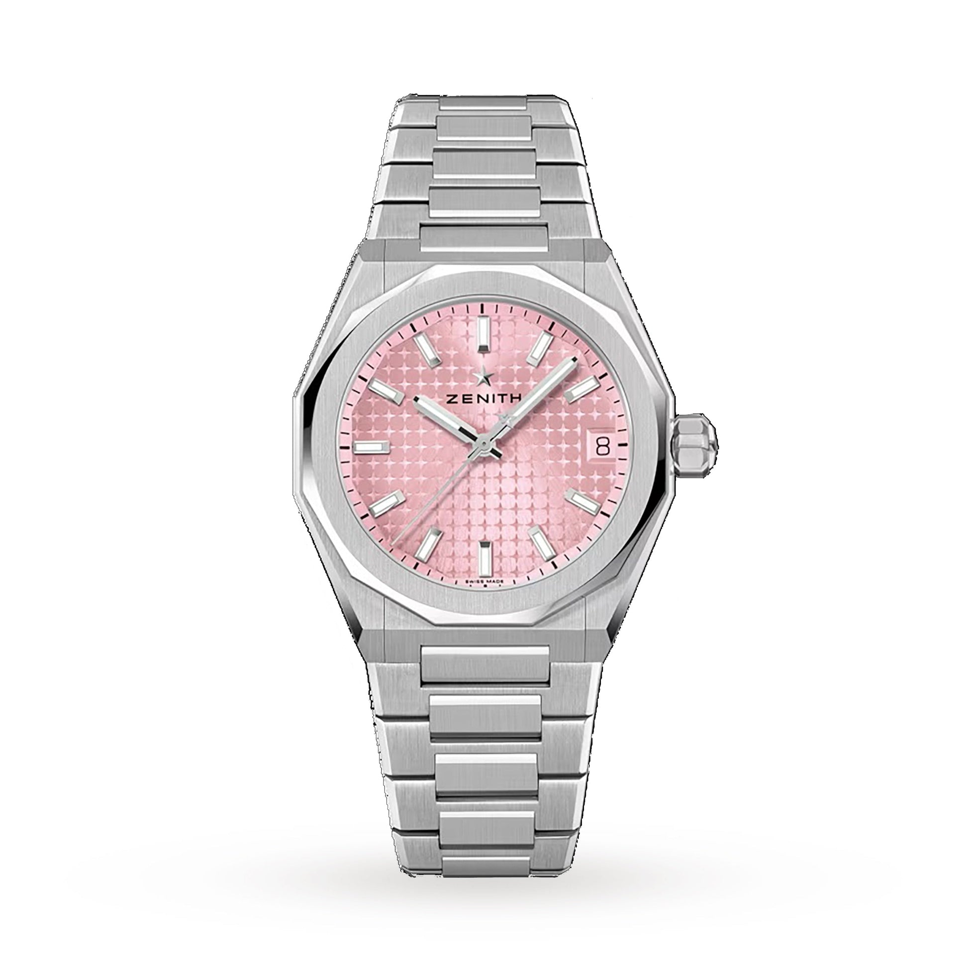 Defy Skyline – the Defy for the new era Sleek and evocative design meets unprecedented function Presented in a 36mm steel octagonal case with a faceted bezel Pink sunburst-patterned dial revisiting the emblematic Zenith four-pointed star Driven by the Elite 670 automatic manufacture, 50 hour power reserve BREAK BEYOND THE BOUNDARIES OF THE CITYSCAPE Break beyond the boundaries of the cityscape and make a statement with the Defy Skyline collection- where modern design meets the relentless pursuit of individuality. Engineered for those who forge their own path, the models in this collection are characterised by bold silhouettes, geometrical dials and urban sophistication. Elevate your style and break free from the ordinary. ELEVATE AND EXCITE WITH A POP OF COLOUR TO A CLASSIC DESIGN Prepare to turn heads with this fresh interpretation of the classic DEFY Skyline, bursting with energy with an elegant flair. Embrace your inner fashionista as this model commands attention, at once brilliant, bold and chic. Tied up within a 36mm steel octagonal frame, adorned with a faceted bezel for a touch of class, this timepiece is a true showstopper. Featuring a metallic pastel pink sunburst-patterned dial, emblematic of the iconic ZENITH four-pointed star, this design captivates a timeless aesthetic for the modern world. Carefully crafted with more modest, unisex proportions to other models in this collection, this design offers a smaller fit to flatter any wrist. Unleash your inner fashionista with an interchangeable steel bracelet and pastel pink rubber strap, turning heads whatever the occasion. The sky is the limit with this elegant take on a classic design, boasting fractional precision, automatic movement, and a 50-hour power reserve for exceptional performance.