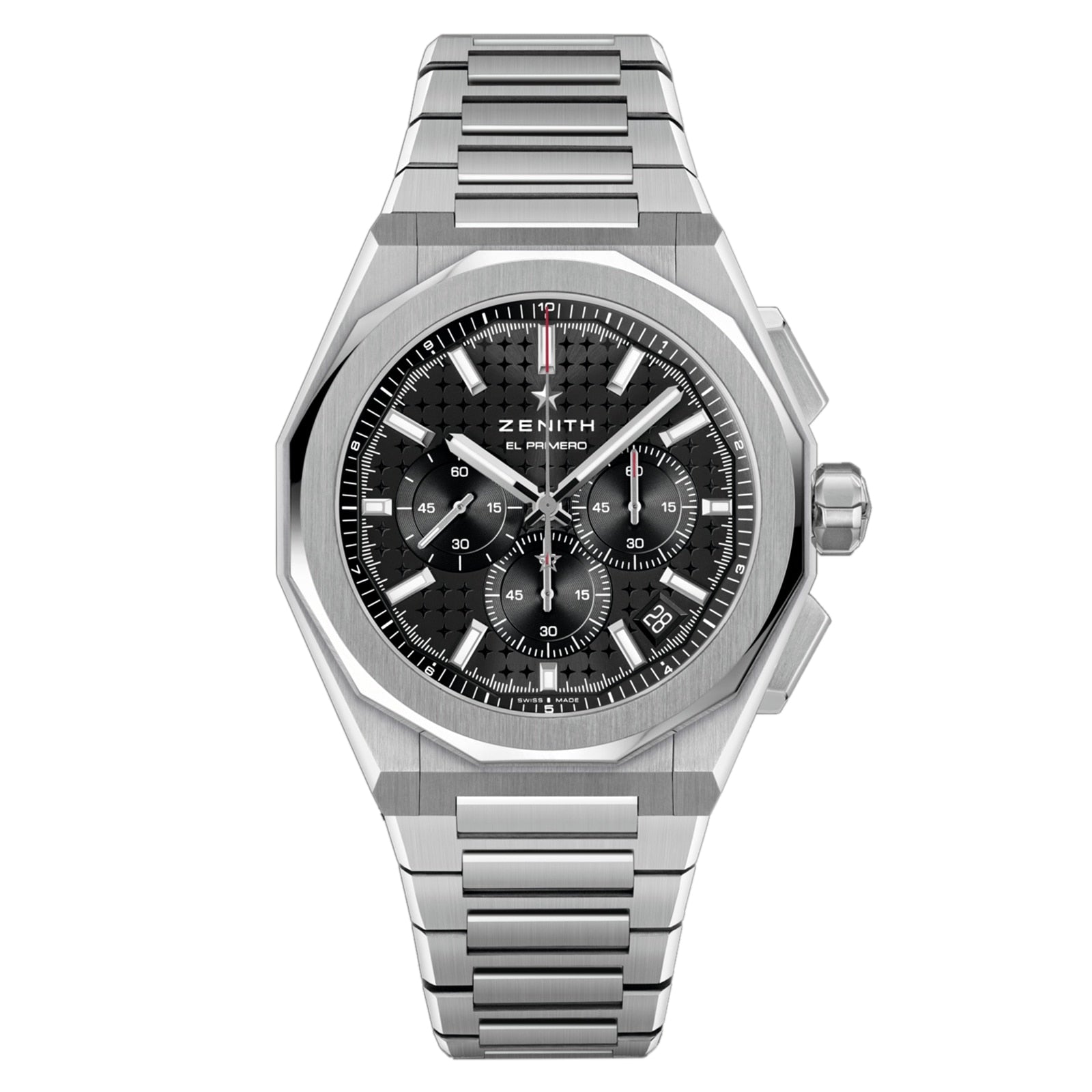 DEFY Skyline Chronograph in a 42mm steel octagonal case with a faceted bezel, featuring a black sunburst-patterned dial revisiting the emblematic ZENITH four-pointed star. Powered by the El Primero 3600 high-frequency automatic manufacture movement with the very first 1/10th of a second indicator. Interchangeable steel bracelet and black patterned rubber strap.
