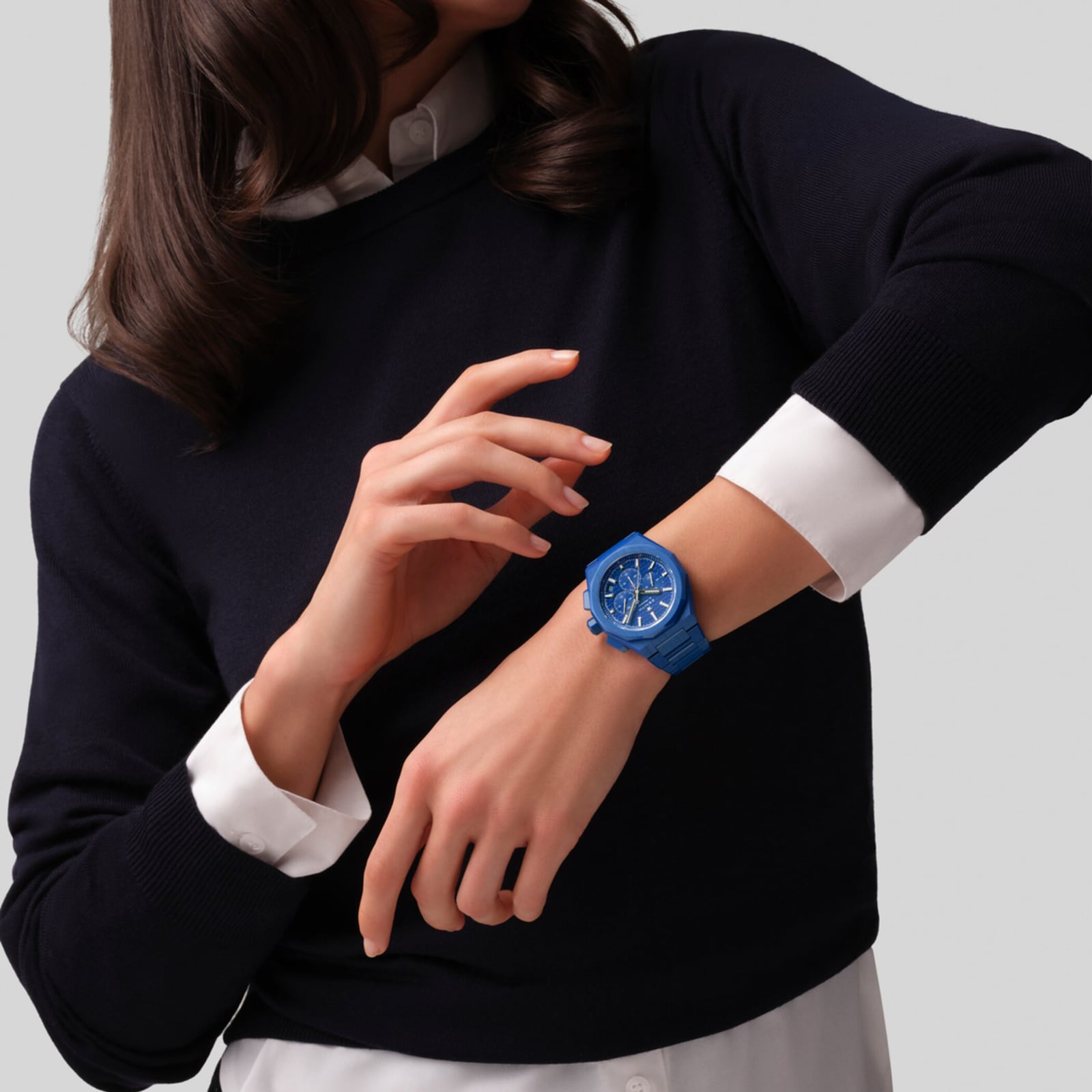 The DEFY Skyline Chronograph in a monochrome blue version. 42mm ceramic case with a multi-faceted bezel and featuring a dial adorned with an engraved geometric motif inspired by the brand’s four-pointed star. Powered by the El Primero 3600 high-frequency automatic manufacture movement with the very first 1/10th of a second indicator. Delivered with both a three-link blue ceramic bracelet and a blue patterned rubber strap that can easily be swapped thanks to our clever strap changing system. Exclusive limited edition of 160 pieces for the 160 Anniversary of the Brand.