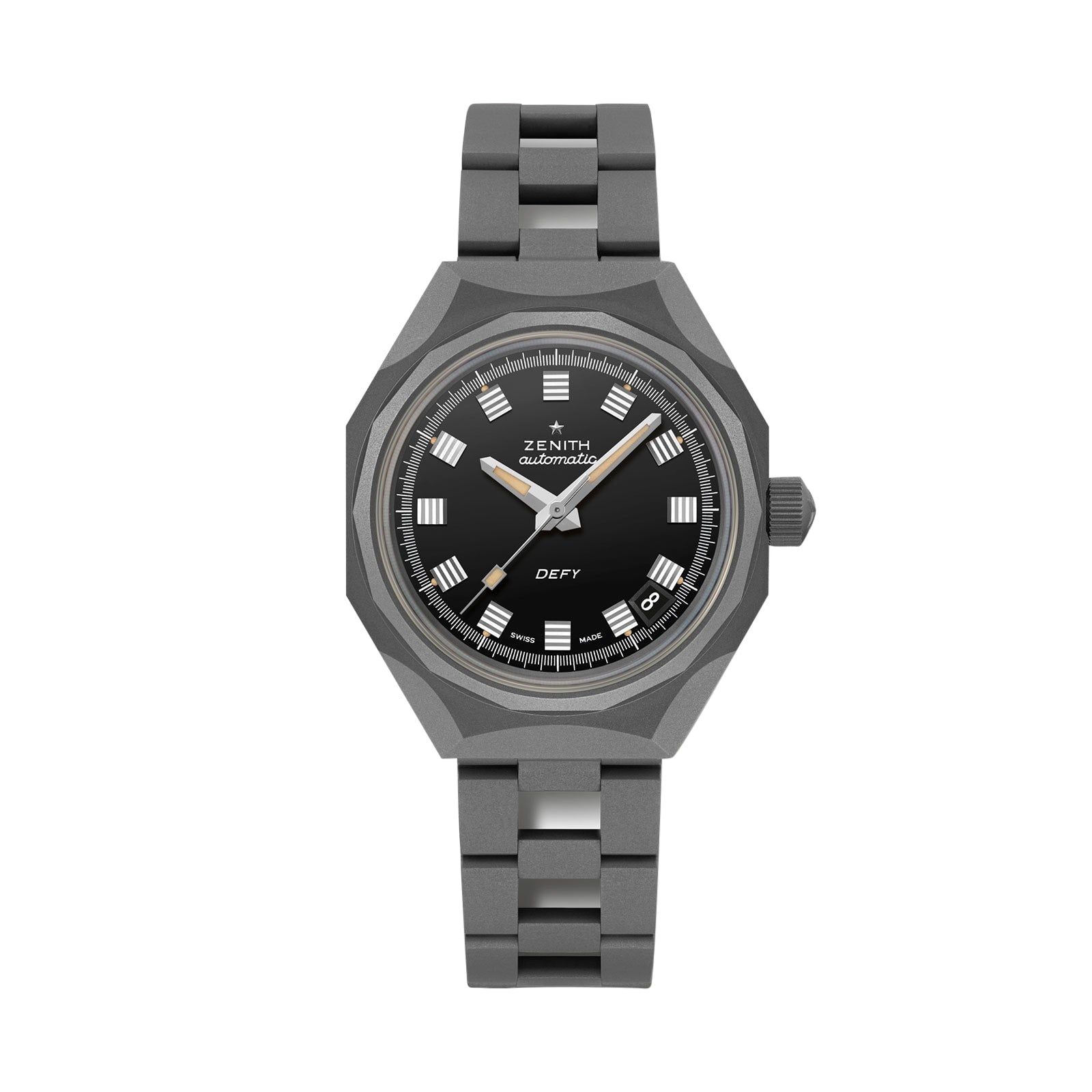 A modern reinterpretation of the original 1969 DEFY model Presented in a 37mm octagonal titanium case Matte black dial with retro- futuristic aesthetic Powered by the ELITE 670 automatic manufacture movement 50 hour power reserve A MODERN MAKEOVER The epitome of Zenith’s endless pursuit of precision through innovation, the Defy collection brings together cutting-edge manufacture movements with futuristic forms and materials. Crafting the future of watchmaking, this forward-looking collection sets new standards of performance and style. CONTEMPORARY ACCENTS Embodying the spirit and aesthetic of the very first DEFY wristwatch from 1969, this modern revival pairs a distinctive, vintage silhouette with contemporary accents through dark tones and muted textures. The 37mm titanium case features an octagonal matte finished titanium case with a 14-sided bezel. The matte black dial is bold yet understated, paired with silvered luminescent markers and hands. Secured with the iconic titanium ladder bracelet, this retro- futuristic timepiece is Powered by the ELITE 670 automatic manufacture movement, with a 50 hour power reserve and water resistance up to 30 bar (300 metres).
