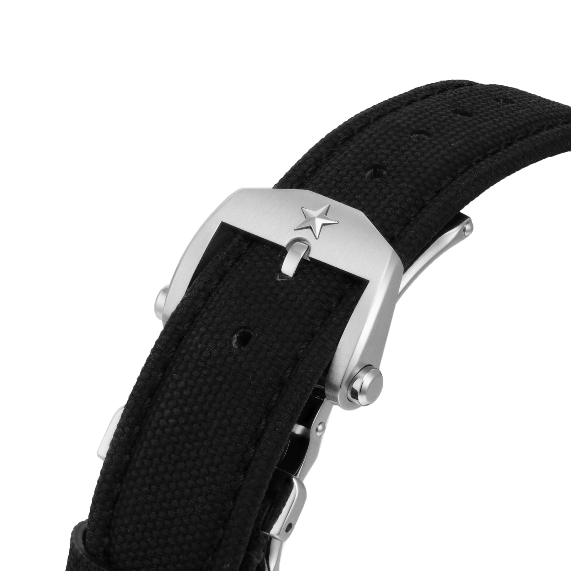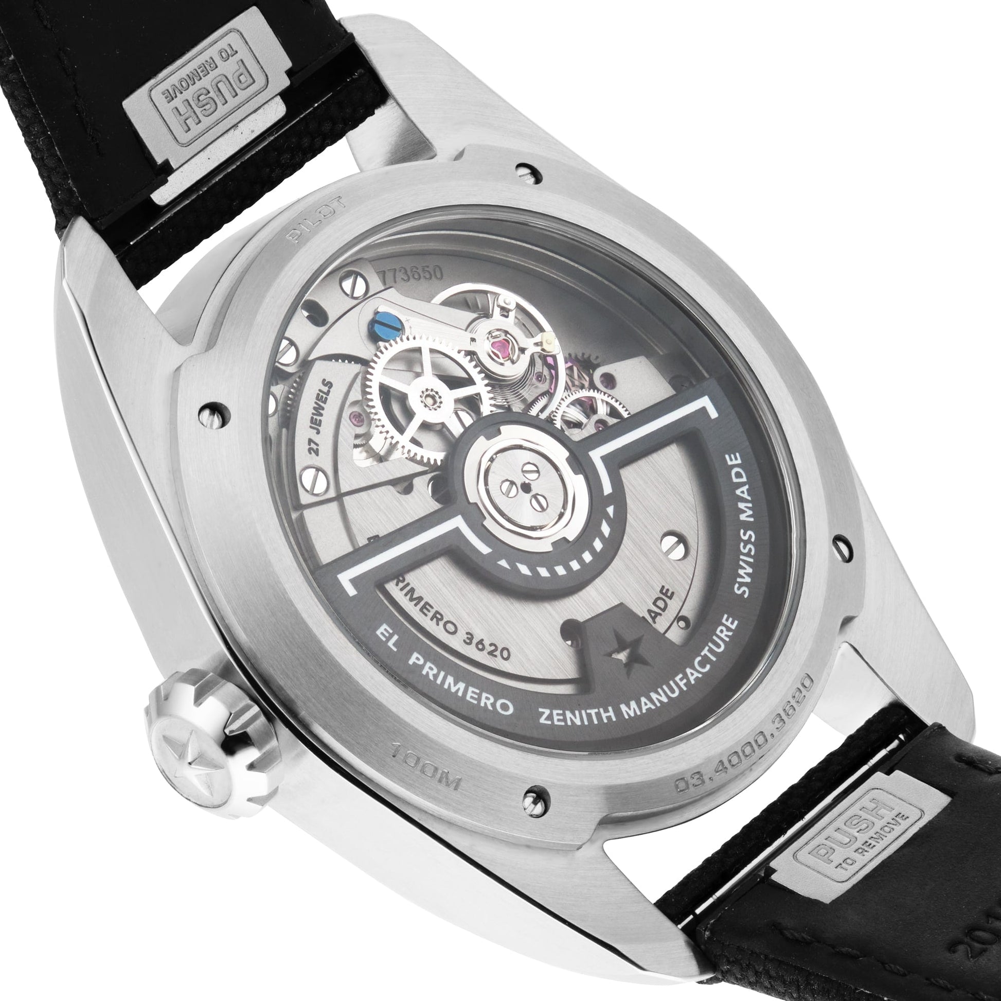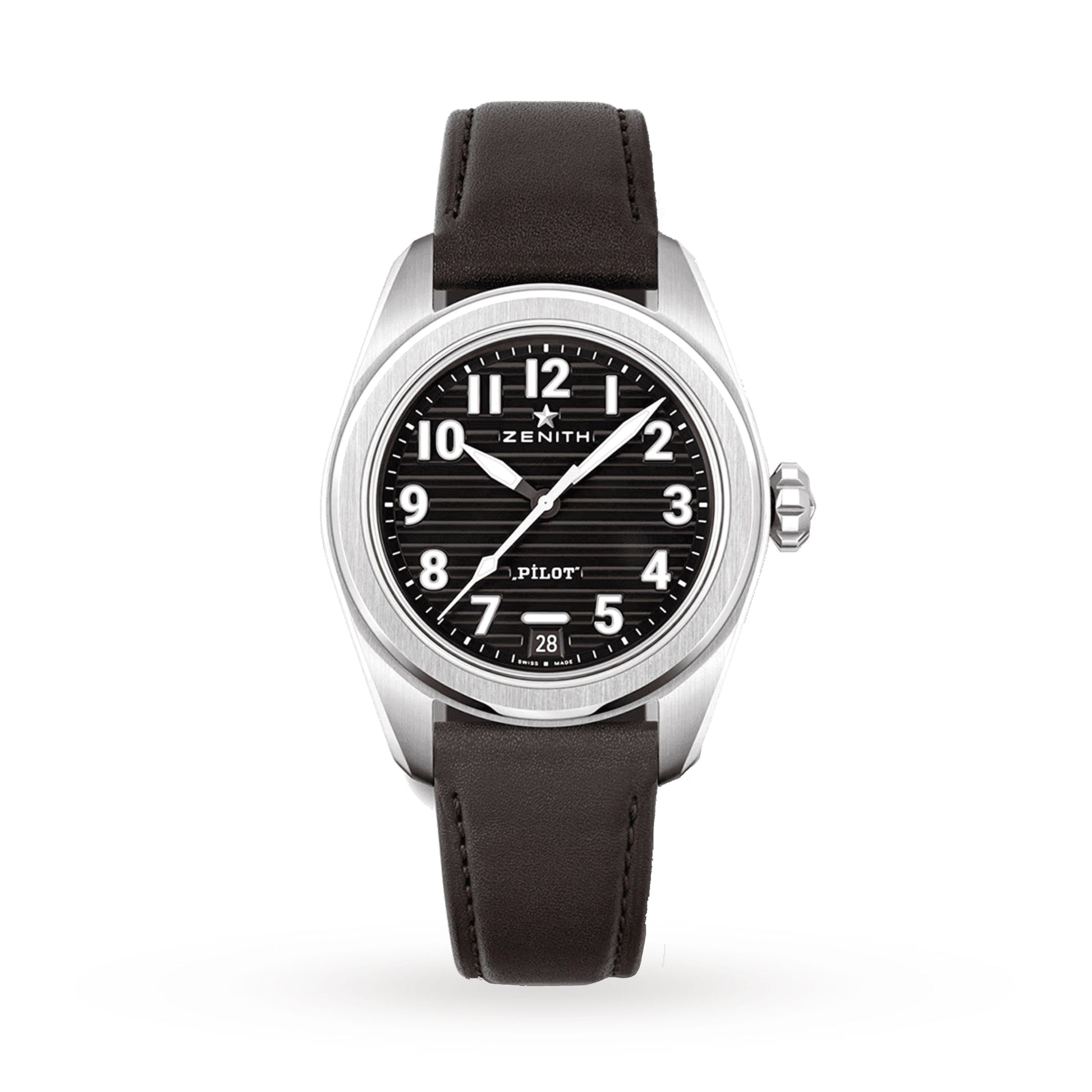 Pilot Automatic – reach new heights Presented in a 40mm stainless steel with an oversized crown Black corrugated dial with coloured indications Driven by the El Primero 3620 automatic high-frequency calibre movement 55-hour power reserve REACH NEW HEIGHTS Reminisc ent of early pilot’s watches, the Zenith Pilot collection features retro elements with distinctly vintage styles that pay tribute to the brands long aeronautical traditions. From the early aviator models of the early 20th century, the range has evolved into the mo dern retelling we see today. AN AVIATOR’S CHRONOGRAPH Journey into the unknown with this robust 40mm model, presented in a stainless steel case, complete with an oversized crown. The black corrugated dial is equipped with large luminescent Arabic numerals for enha nced visibility, and an oversized date display and two sub-dials. ≤p>Presented with interchangeable black cordura- effect rubber and brown calfskin leather straps, the timepiece is powered by the El Primero 3620 automatic high-frequency calibre movement, with a 55-hour power reserve and water resistance up to 10 bar (100 metres).