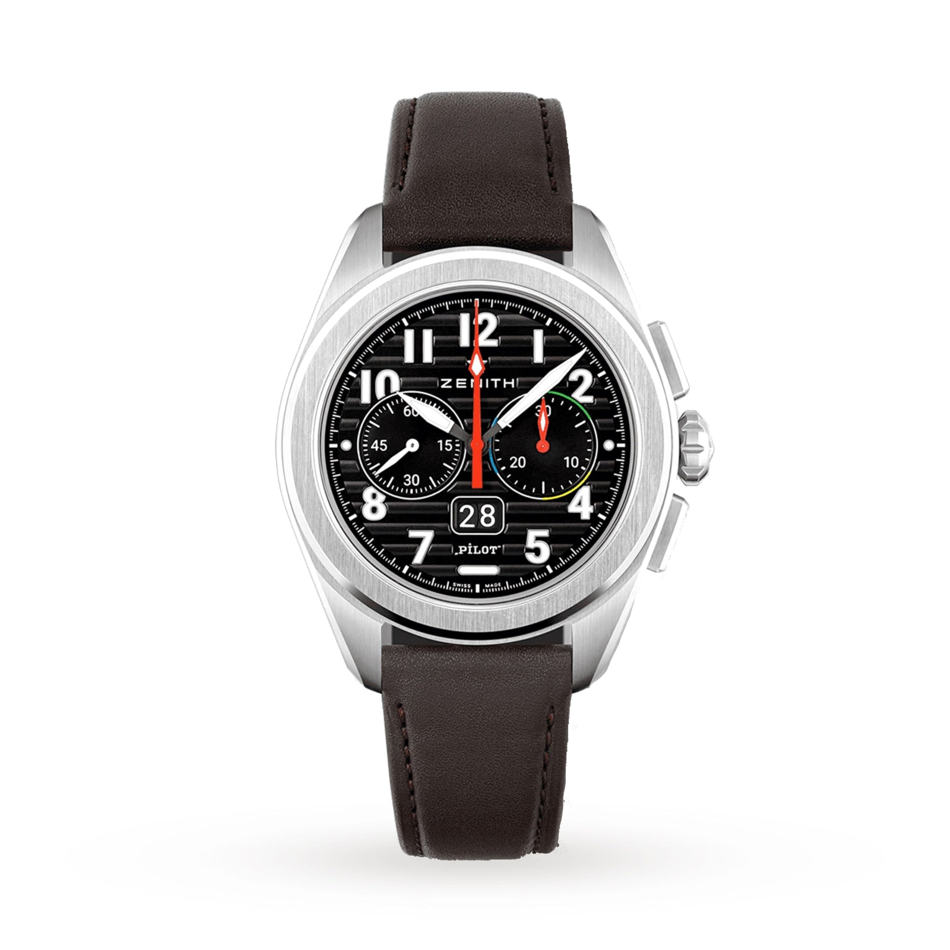 Pilot Big Date Flyback – the sky is yours Presented in a 42.5mm black ceramic case with an oversized crown Black corrugated dial wit h coloured indications Driven by the El Primero 3652 automatic high-frequency calibre movement 60-hour power reserve THE SKY IS YOUR S Reminiscent of early pilot’s watches, the Zenith Pilot collection features retro elements with distinctly vintage styles that pay tribute to the brands long aeronautical traditions. From the early aviator models of the early 20th century, the range has evolved i nto the modern retelling we see today. AN AVIATOR’S CHRONOGRAPH Take to the skies with this sleek and stylish 42.5mm model, presente d in a black ceramic case, complete with an oversized crown. The black corrugated dial is equipped with large luminescent Arabic num erals and coloured indications for enhanced visibility, and an oversized date display with a next-gen patented mechanism that advanc es and stabilises both of the timepiece’s wheels in under 0.03 seconds. Powered by the El Primero 3652 automatic high- frequency cal ibre movement, the model is also equipped with a flyback function, which allows the chronograph to be reset to zero and restarted by a single push of a button, making it easy to operate even when wearing thick pilot’s gloves. ≤p>The watch is supplied with two i nterchangeable rubber straps – one black and one khaki. Featuring a 60-hour power reserve, the piece is water resistant up to 10 bar (100 metres).